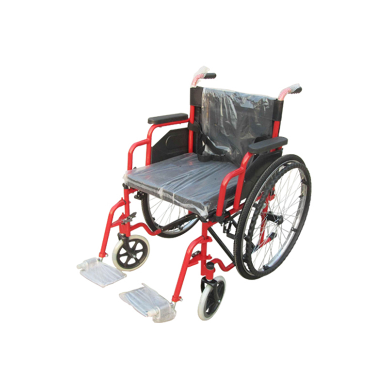 • 8” solid front castors, front fork made with high strength steel sheet, 24”inflatable rear wheels with Nylon handrim, with hand brake;